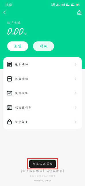 5、实名认证成功的用户,就会进入到零钱页面,会提示“实名认证成功”。
