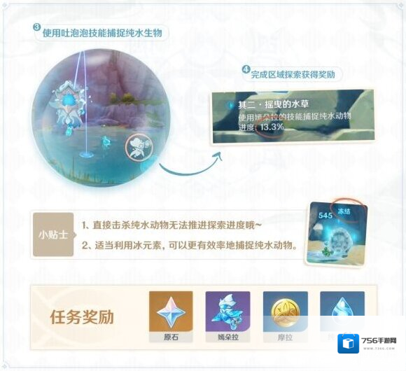 适当利用冰元素,可以更有效率地捕捉纯水动物。当泡泡困住纯水动物时,嫣朵拉可将其吸收融合,吸收融合后区域探索进度会相应增长。当完成探索时,可以获得当前区域的奖励。