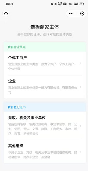 5、同意授权个人信息、头像后,选择需要申请注册的商家主体,根据自己的情况选择;