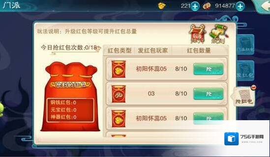 我要红包中分为门派红包,发红包,抢红包三个面板,门派红包和抢红包都是可以领取到铜钱、元宝、神器的,不要让自己感觉像错过了几个亿的红包,快加入一个门派吧!