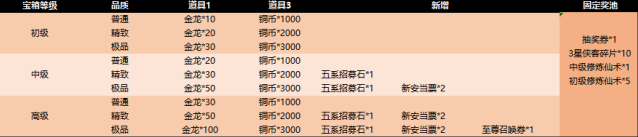初级类宝箱,主要产自28级世界Boss关卡,依据大家开服至今的等级(46~50)基本不大会选择获取;那么中级、高级类宝箱,将是我们后续主要获得道具,可参考下方表2: