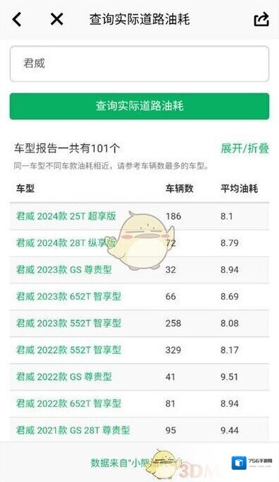 4、点击查询后可以在下方的位置查看相应车型的平均油耗情况。