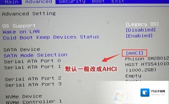 4、再将移动上下方向键,移动到Advanced中将SATA Mode Selection选项的启动项更改为AHCI,否则安装WIN7会出现0x00007b蓝屏,然后再F4保存设置,见截图: