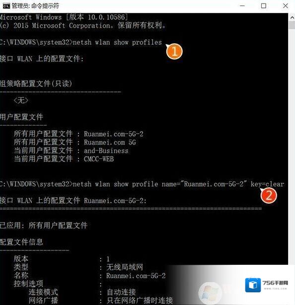 3、在给出的曾经使用过的WiFi连接中选择你想查询的连接名称,然后套入如下命令(上图②号命令)中查询密码: