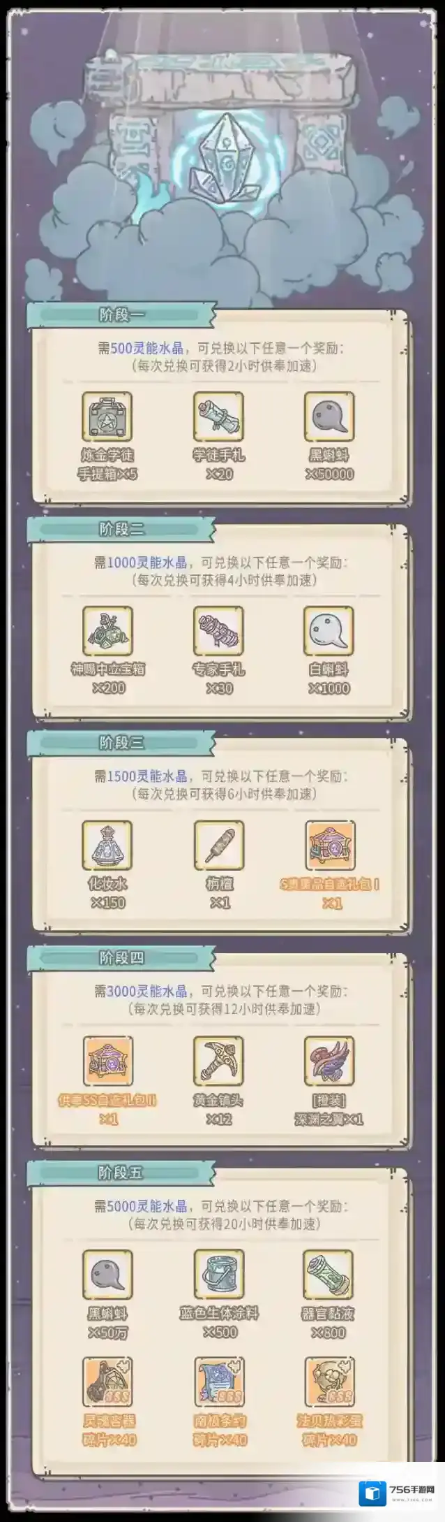 5、使用供奉加速1小时,每次获得6灵能水晶,上限200小时,合计获得1200灵能水晶