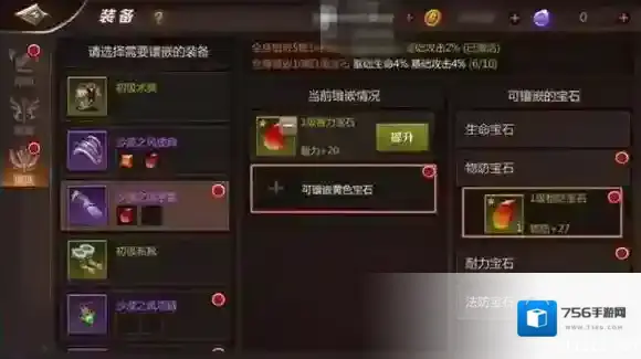 最后就来到宝石镶嵌了。宝石分为红宝石、黄宝石、蓝宝石和彩宝石。它们提供的属性比较全面,但是我只需要那些提升输出宝石,毕竟法师需要剑走偏锋,有了高输出在队伍中作用才大。红宝石我们选择智力、蓝宝石选择暴击和格挡,彩宝石可以选择暴击伤害。一颗1级智力宝石可以为我们提供20点智力,这个提升可是相当可观哦。至于黄宝石,只有防御属性可以选择,我们可以选择耐力来全面提升自身的防御属性。