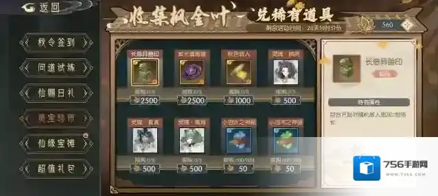 本次活动的代币有两种,一种是枫金叶,这个是用来兑换奖励的,还有一种是灵刃符,这个只能是用来砍一刀的,下面会介绍这个玩法,其余奖励均为常规材料。
