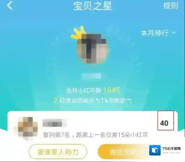 如果我们想增加小红花数,提高小朋友的排位,宝贝之星中的任一个小朋友头像,进入“宝贝之星”;可以看到我们暂列第七名,据前一名仅差20朵小红花,我们的小红花数是“35”朵。我们点击下方的做任务助力;