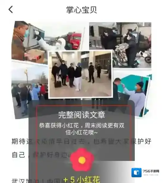 阅读文章完成之后,会弹出对话框:完整阅读文章,恭喜获得小红花,+5小红花;