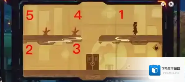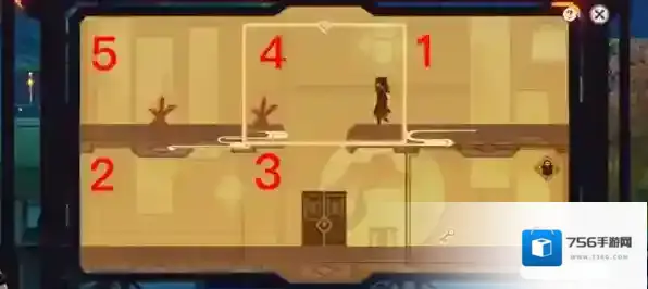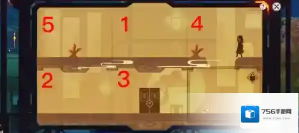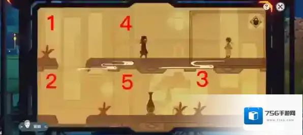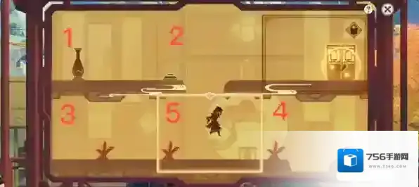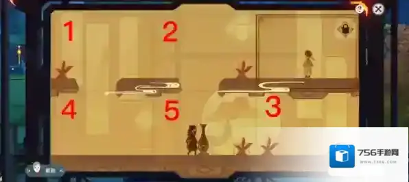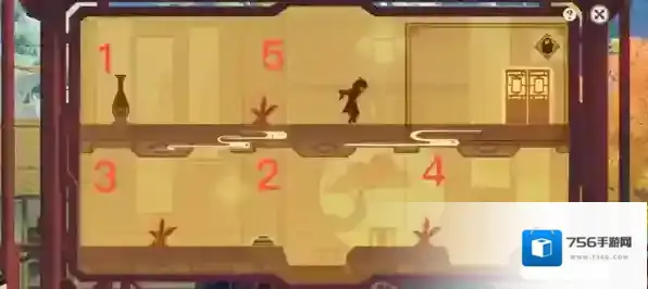 人物掉下来再次踩过机关,当人物走到花瓶所在的背景5时,选中背景3与背景1互换