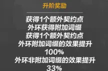 每升一阶,对应属性会激活,变为蓝色。比如1-2,获得一个额外的契约点。(也就是说正常情况下你想点满30个契约点,必须把等级升到100级后获得24点契约点,并且带3个至少升到4阶的任意契灵才能获得30点契约点。2阶升3阶后,外环大点可获得附加属性,一般是对应契灵种类相关的词缀