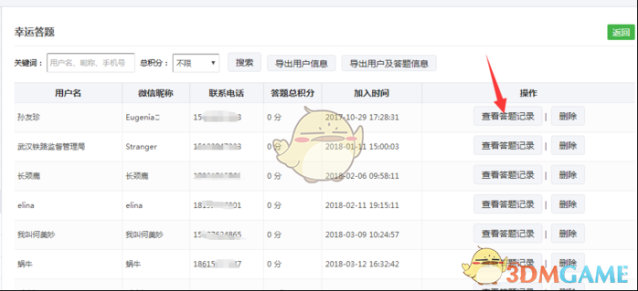 第五步:回到微信答题活动制作后台,点击用户信息,即可看到所有粉丝差价在线闯关答题的记录,最后还可以将这些信息都导出,方便管理