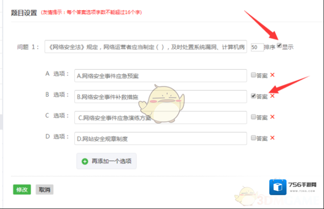 第三步:添加题目,微享宝答题活动题库是完全自定义的,点击题目设置,自己即可添加,注意行末尾答案位置在正确的地方干打个勾;设置好以后点击–再添加一题,以此类推,全部都设置好以后点保存。