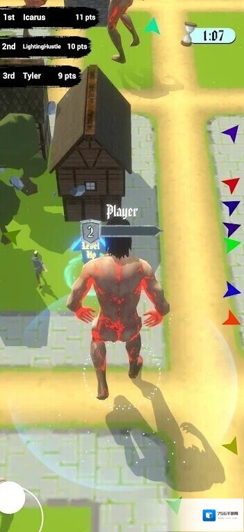 2、左上角显示玩家排名和得分,右上角显示倒计时“1:07”,画面中角色背后有特效,角色上方有“Player”标识,还显示“Levelup”(升级)。