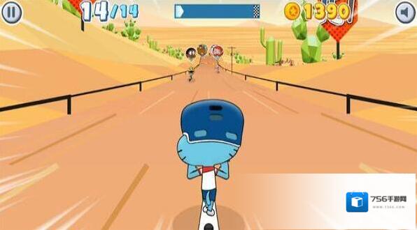 3、竞速对抗与其他卡通角色(如顶部显示的对手)在赛道比拼,通过灵活操作,争取率先到达终点(蓝格旗)。