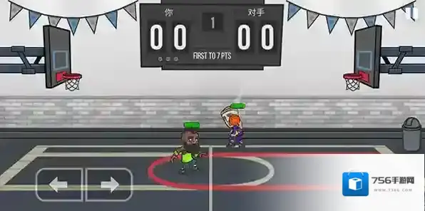 2、我们按住屏幕左下角的两个箭头可以控制角色移动,用手指按住屏幕右侧空白区域可以控制角色跳投,不过跳投的时候的注意一点,在主角跳到空中的时候就得放开手指,否者我们的角色是不会将篮球投出去的。