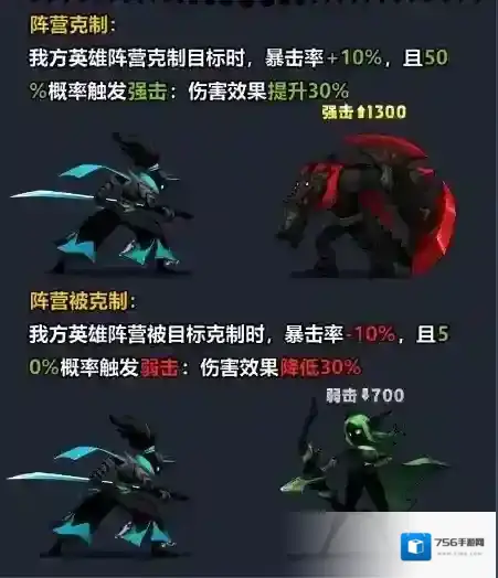 当我方英雄阵营克制目标时,将会提高暴击、触发强击以及提升伤害,反之,若被克制时,将会减少暴击、触发弱击以及降低伤害。