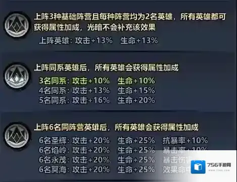当上阵的英雄为同系英雄时,相同羁绊英雄之间将会获得额外属性加成效果。随着同系英雄的上阵人数增加,相关英雄所获得的羁绊属性加成也会随着提升。