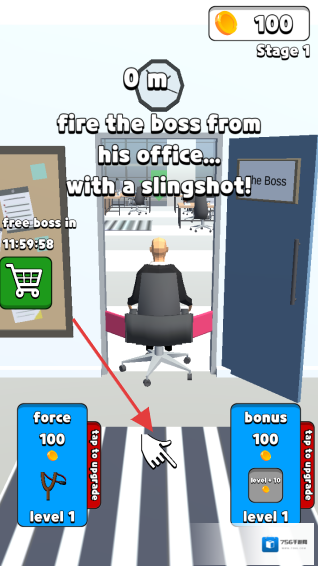 1、依据“fire the boss from his office… with a slingshot!”提示,点击下方弹弓区域,拉动弹弓瞄准办公室内老板,释放将其击飞,开启关卡。