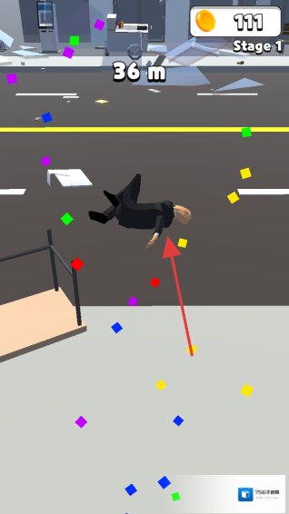 2、老板被弹射至户外后,借助场景彩色碎片,关注飞行距离(36m),利用物理弹射规律,让老板尽可能飞远,积累金币,为后续升级蓄力。